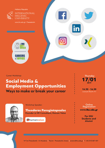 Description: Social media present plenty of opportunities for advancing your career, helping to get access to people and job openings.  There are ways though, that they can damage your reputation and personal image and deny you access to the job market.  In this workshop, we will see what you can do to use Social Media as tools for job search and what mistakes to avoid.